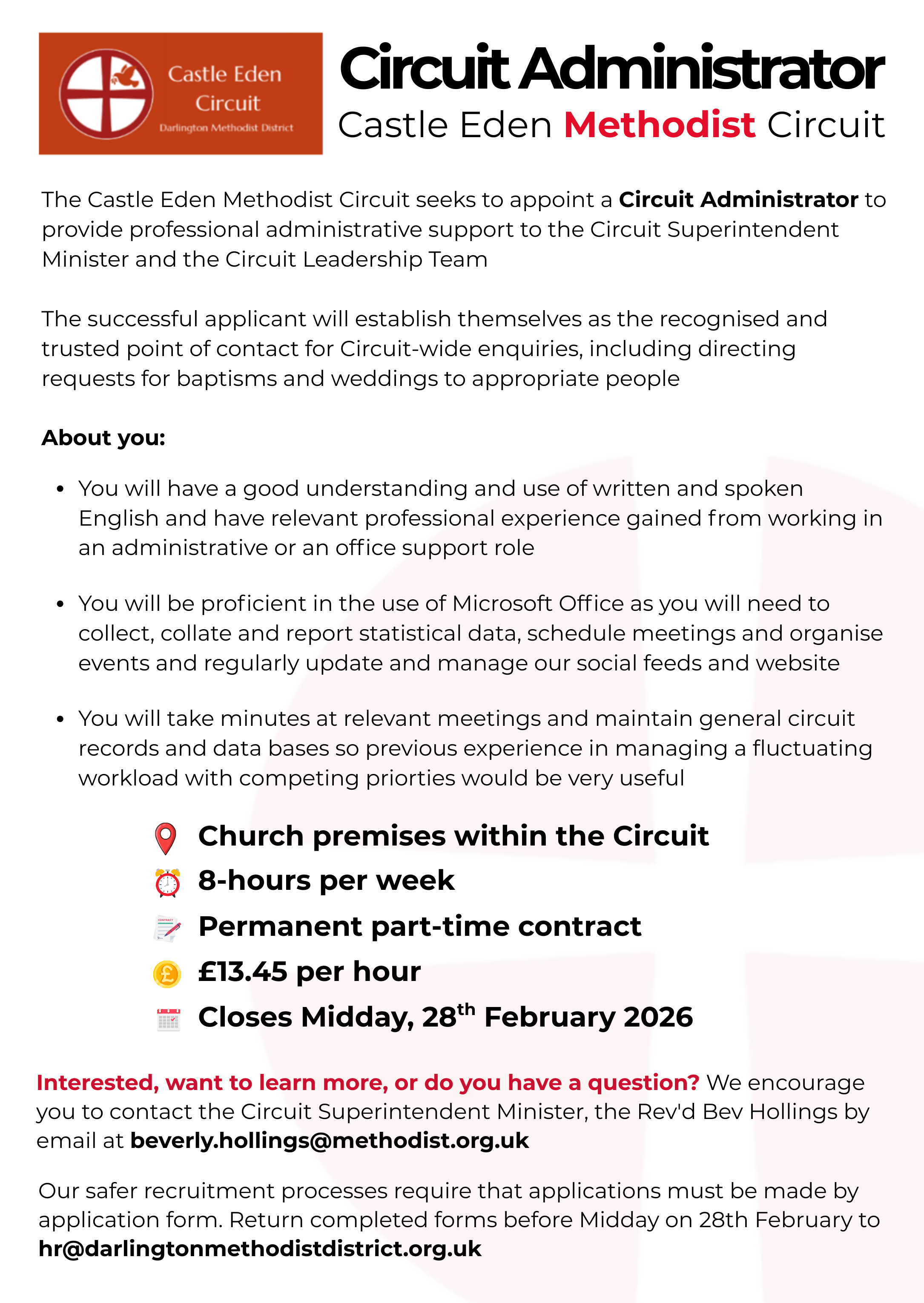 Please note: As part of our safer recruitment processes, CV's will not be considered at the shortlisting stage. All applications for employment should be made on a Methodist Church application form, a copy of which is available to download here.