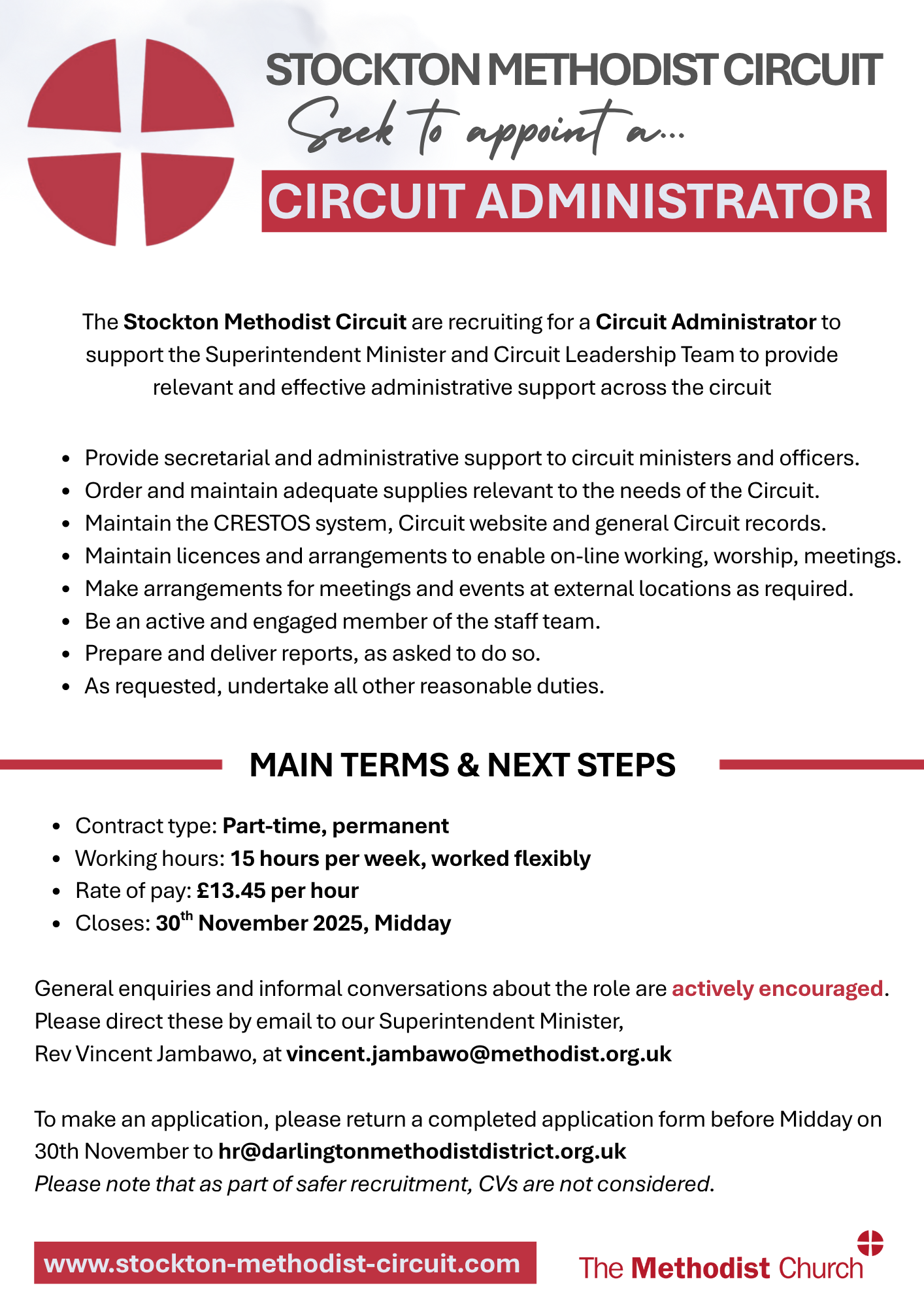Job title: Circuit Administrator Application form Job advert Job PackEmployer: Stockton Methodist CircuitLocation: Church premises within the Stockton CircuitCloses: 30th November 2025, Midday